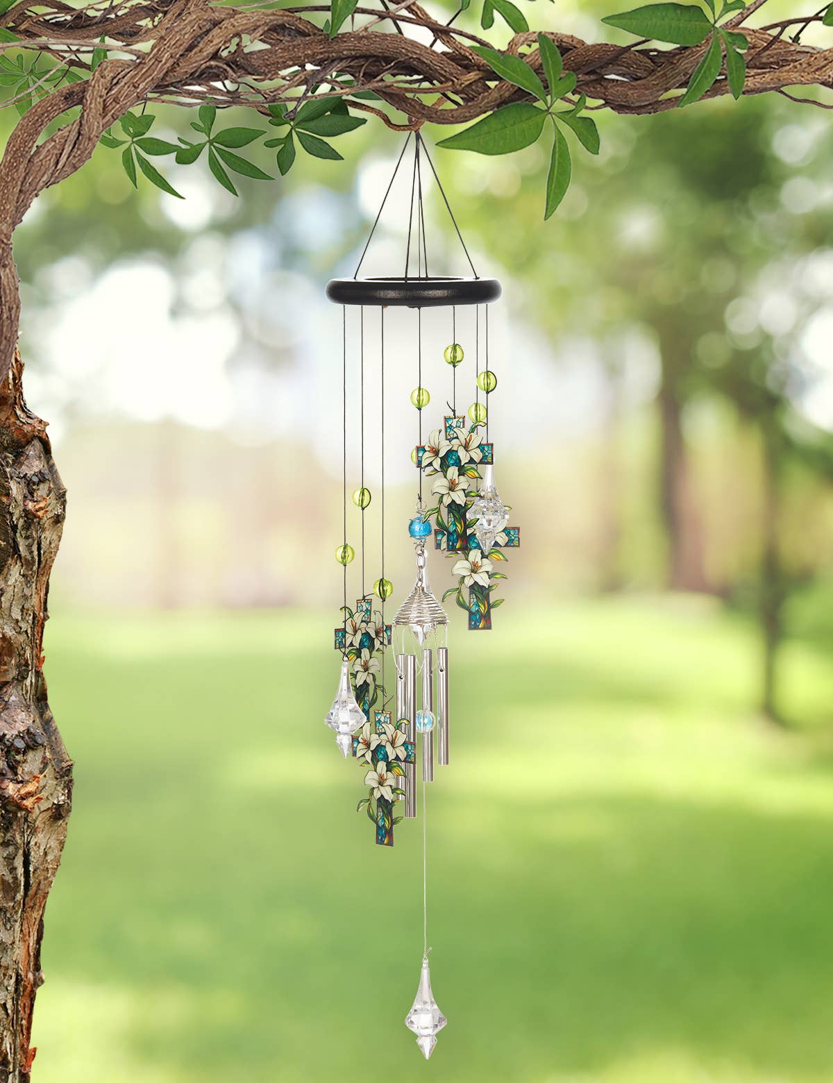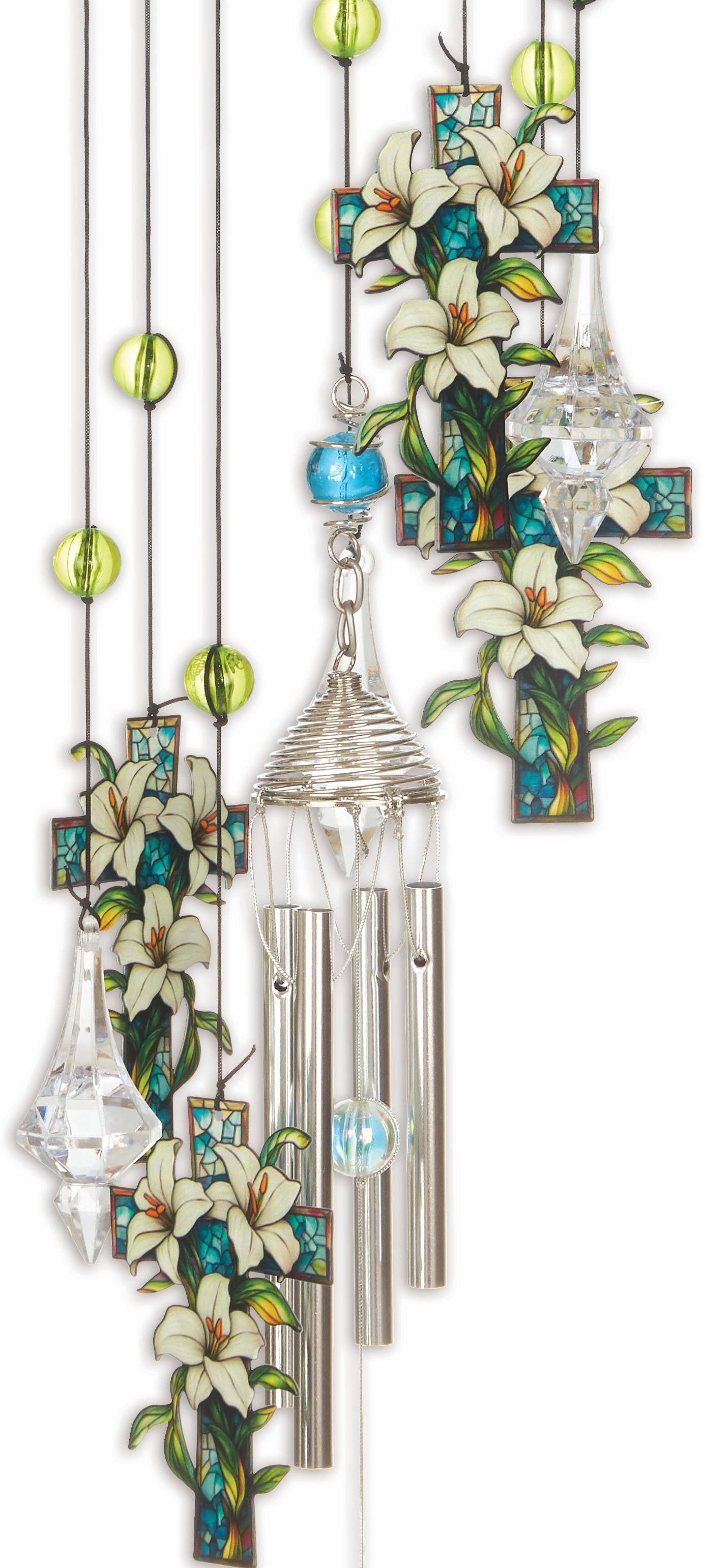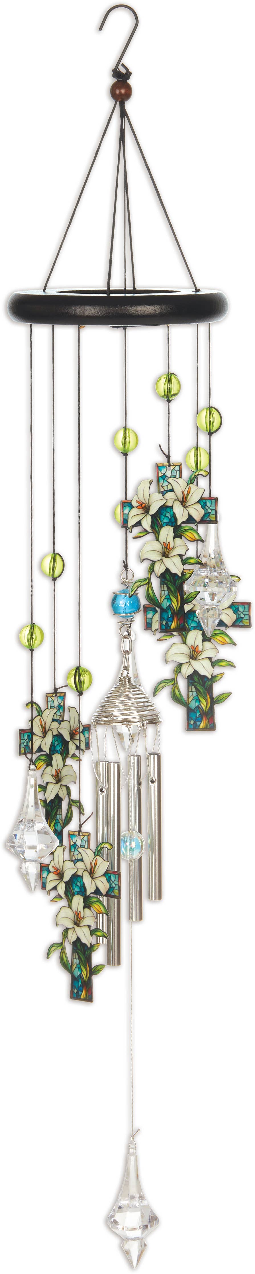The Serenity Holly Cross Chime features four beautiful Crosses with Lily’s that shifts in the breeze creating a soothing sound.