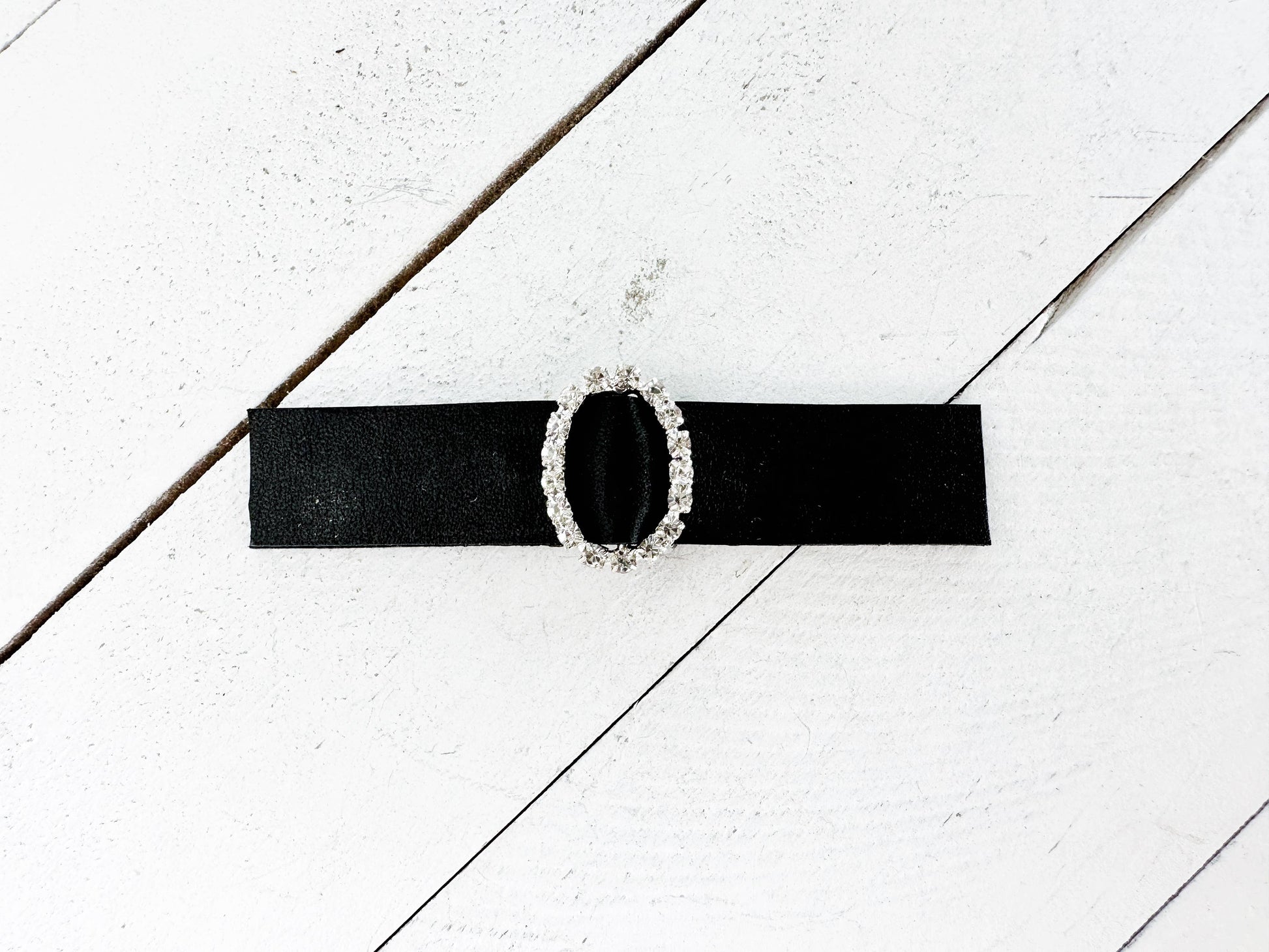 Cute, oval-shaped rhinestone center on black leather strap w/ grip clips on back.