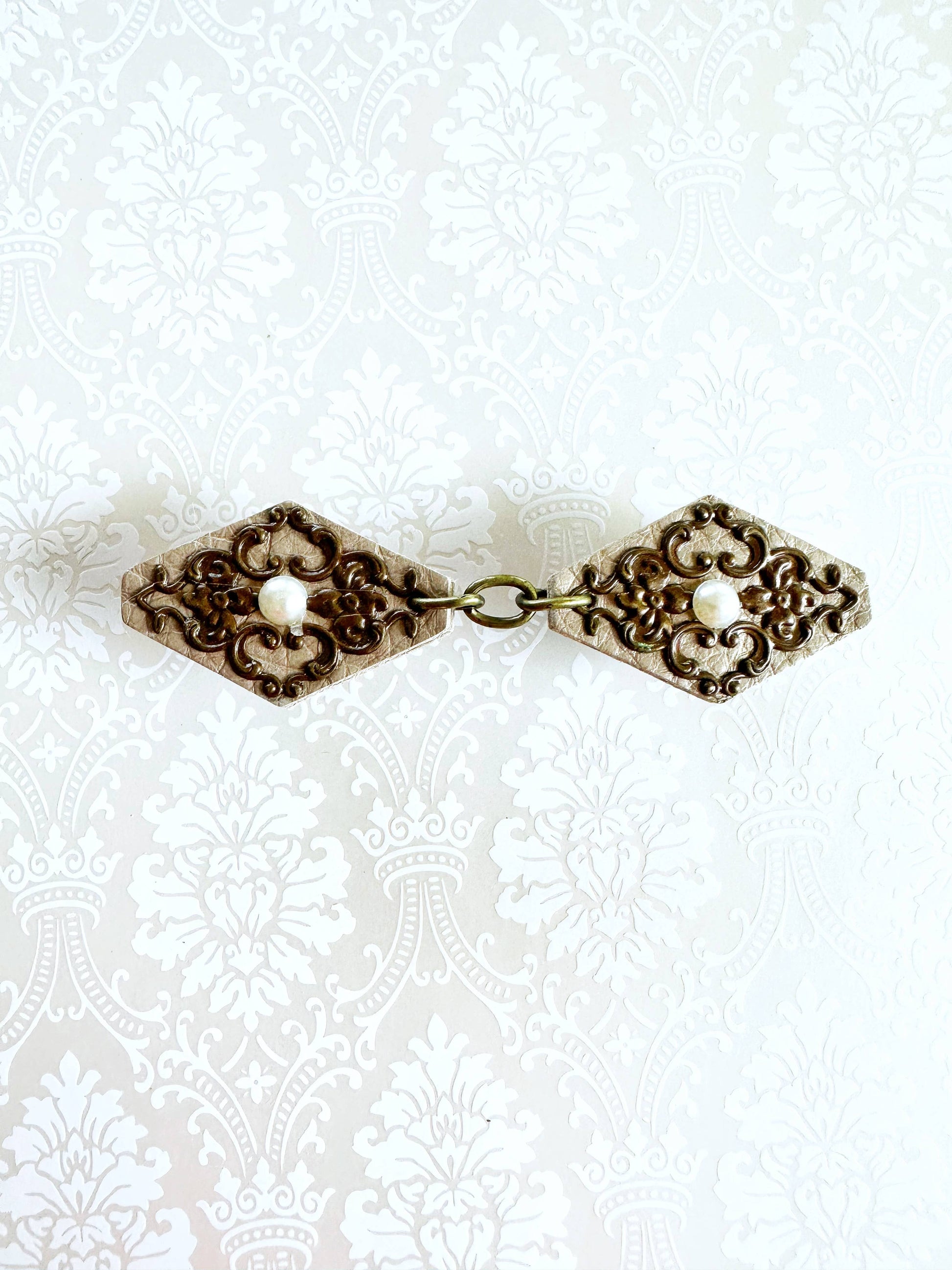 Double bronze ornate metal scroll on a base of champagne leather. A pretty, dainty Victorian look that adds an elegant touch to any outfit.