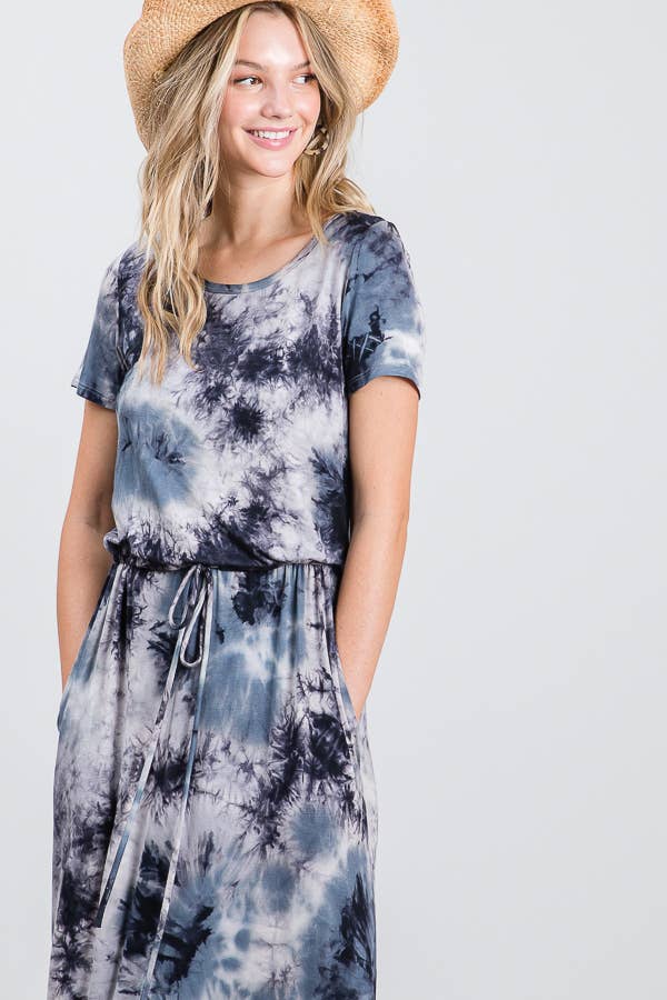 Tie Dye Maxi Dress with Pockets, short sleeves, Round Neck, And a drawstring waist.