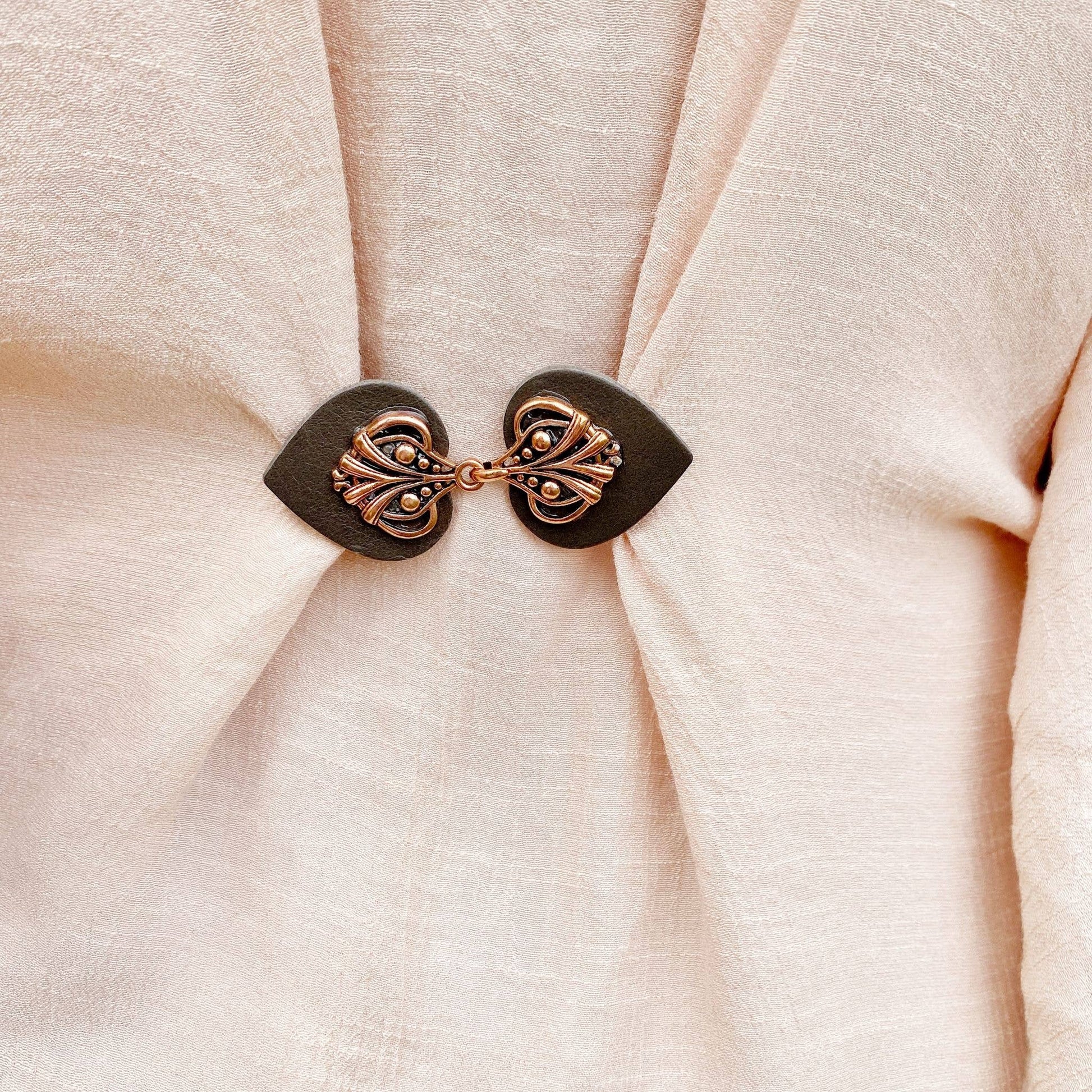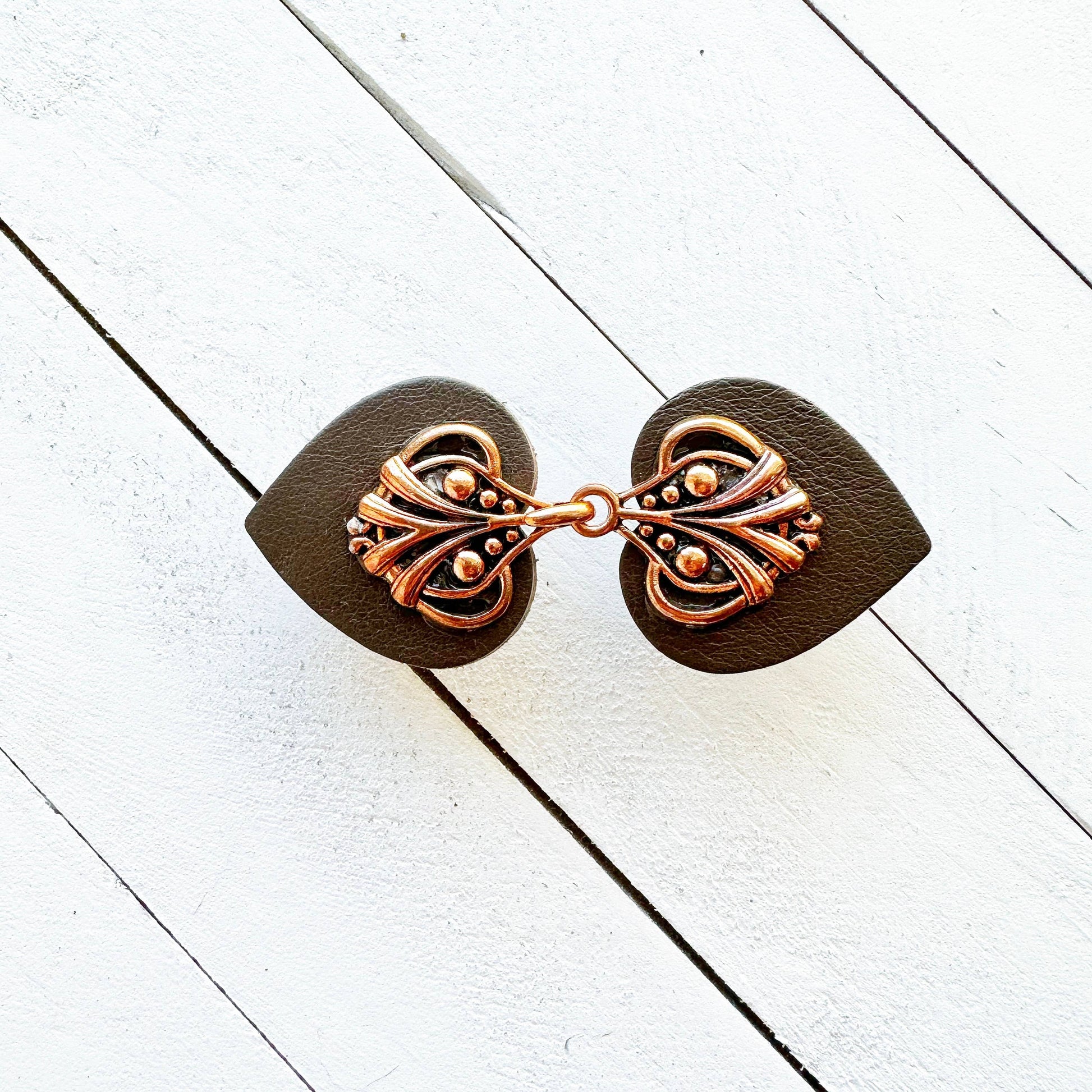 Copper hardware on dark gray leather clip. A hint of vintage & a touch of boho. Perfect for minimalists, romantics, bohemians, & comfort seekers. KardiKlips are like having a mini-tailor at your fingertips, providing a quick & easy way to tailor your outfit to your unique and individual shape. These small adjustments can make a big difference by hiding bulges, highlighting curves, or simply providing a secure way to fasten any garment. Ideal for: Dresses Cardigans Sweaters Kaftans Kimonos Jackets Tunics Cloaks Capes Belt Alternative 3 inches long X 1.25 inches wide.