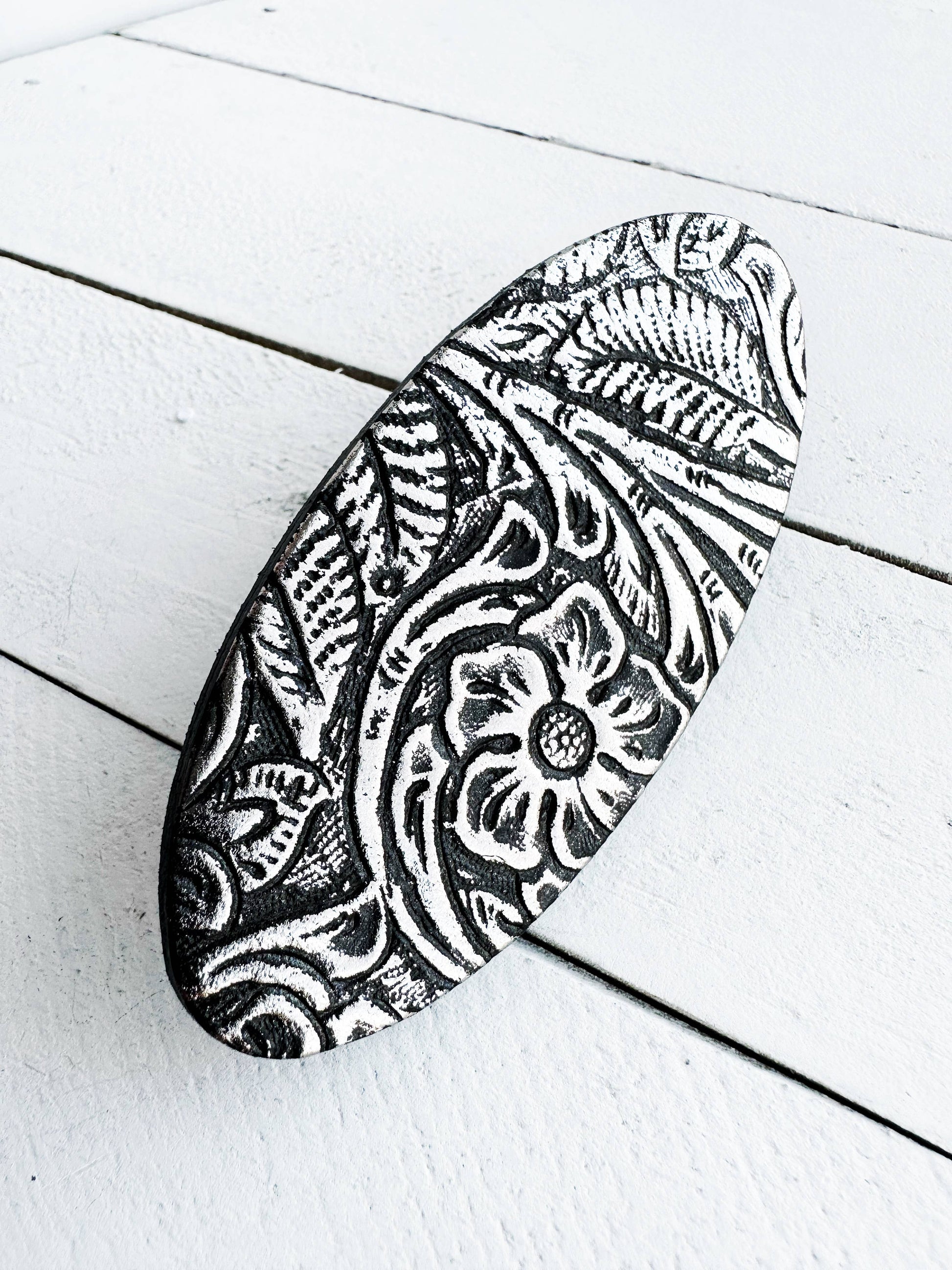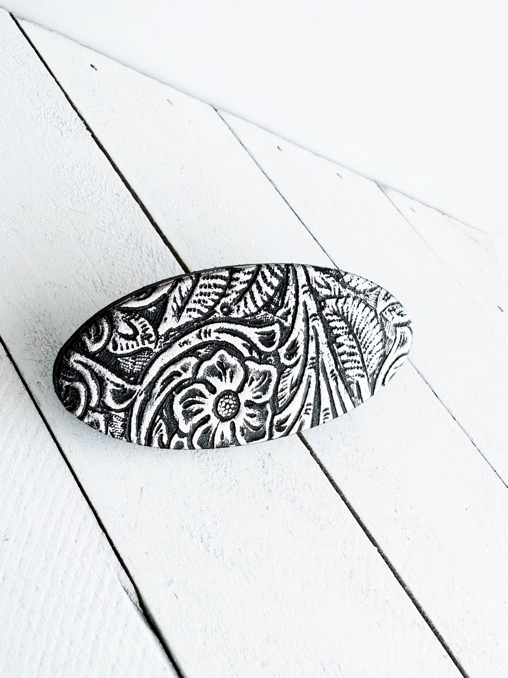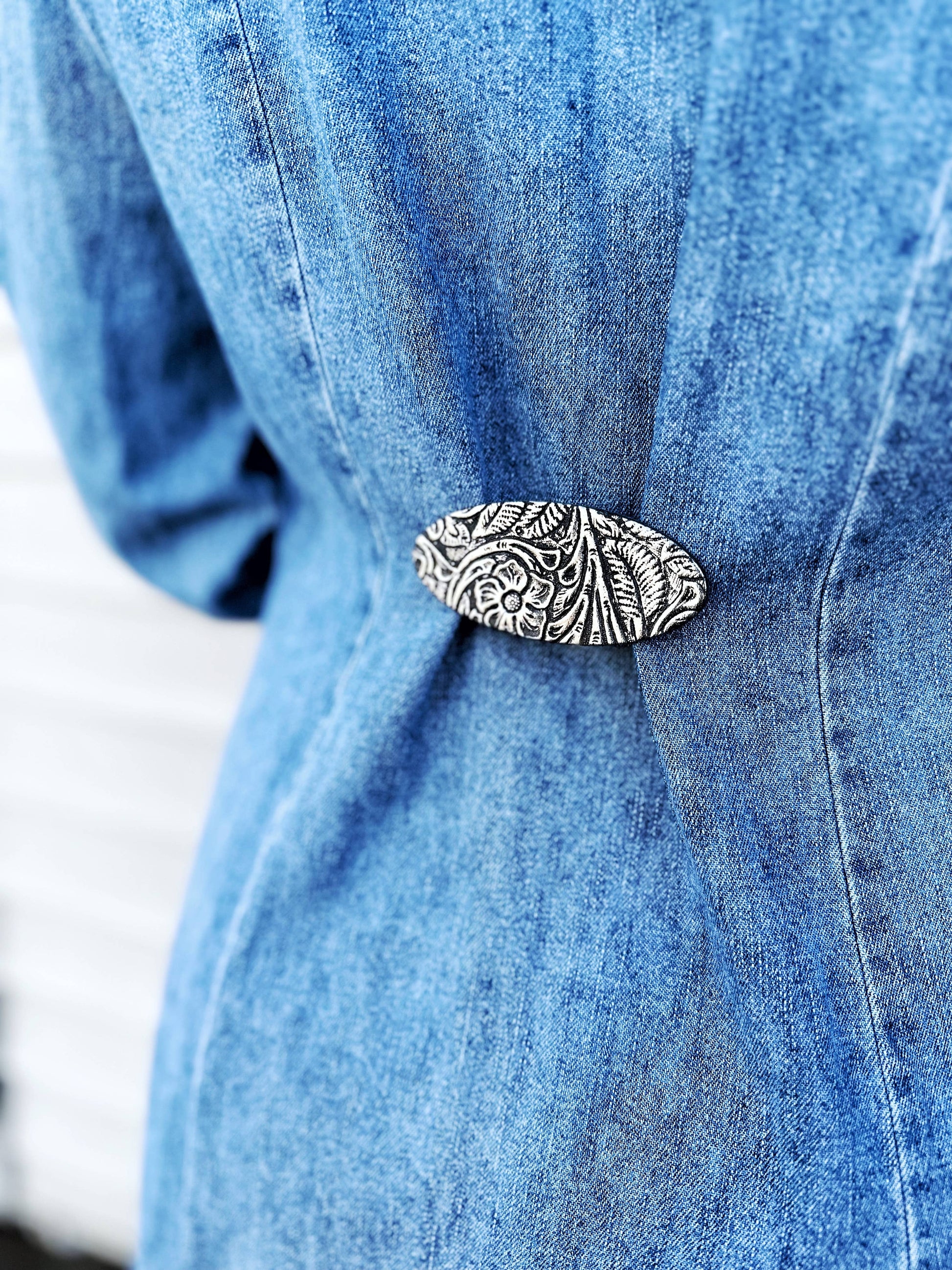 "Impressions" - Black leather imprinted with a raised floral & leaf pattern in brushed metallic silver. KardiKlips are like having a mini-tailor at your fingertips, providing a quick & easy way to tailor your outfit to your unique and individual shape. These small adjustments can make a big difference by hiding bulges, highlighting curves, or simply providing a secure way to fasten any garment. Ideal for: Dresses Cardigans Sweaters Kaftans Kimonos Jackets Tunics Cloaks Capes Belt Alternative 3 inches long X 1.25 inches wide.