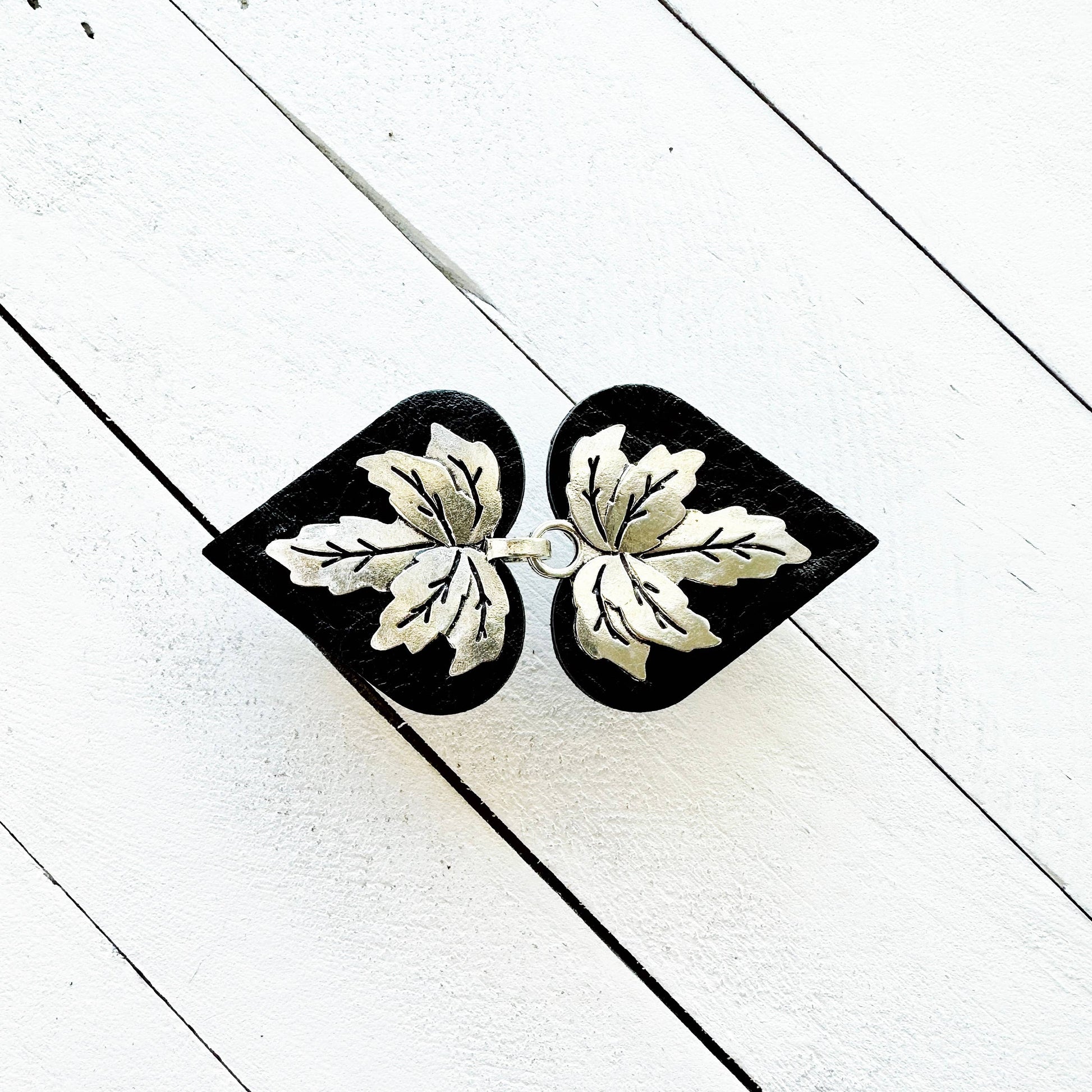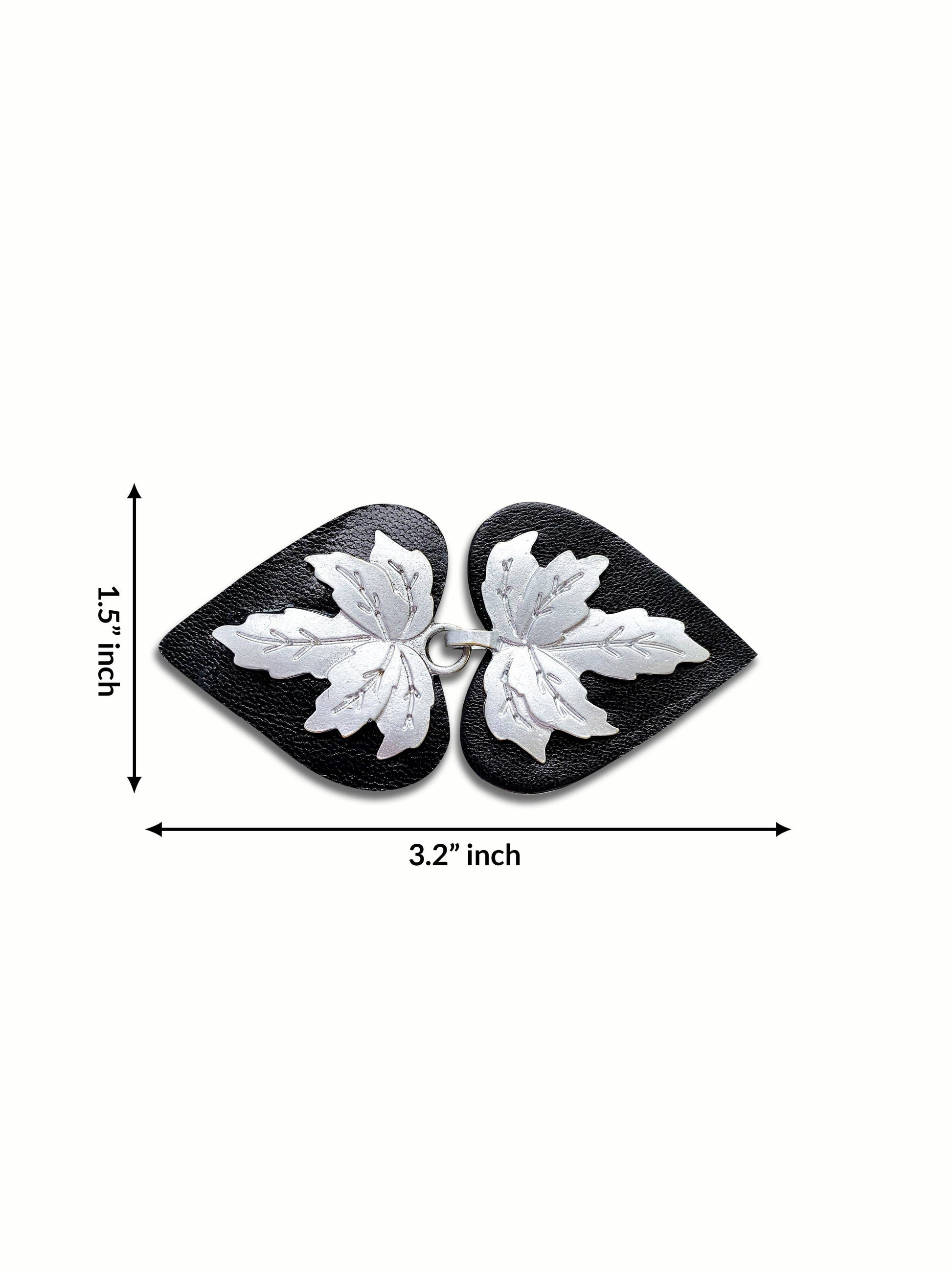 Interlocking Silver Metal Leaf Hardware on Black Leather. Earthy & Otherworldly, Practical yet Whimsical. KardiKlips are like having a mini-tailor at your fingertips, providing a quick & easy way to tailor your outfit to your unique and individual shape.